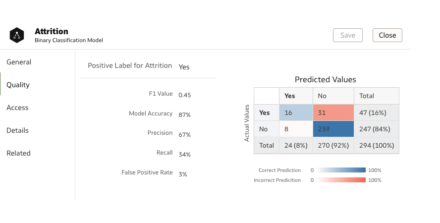 Models trained within Oracle Analytics Cloud can be checked for quality and accuracy. For example, this Naïve Bayes binary classifier has been trained with attrition data, and the quality of the algorithm is rated against the known true values from the test data.