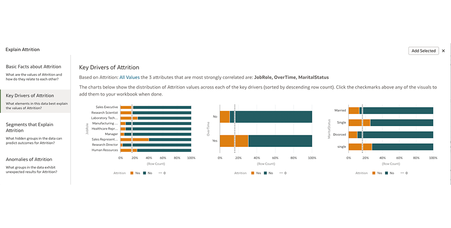 With only a few clicks and no coding, you can use the Explain capability to examine the data set and identify meaningful business drivers, contextual insights, and data anomalies. Choose visuals and findings from Explain to start a new dashboard and story.