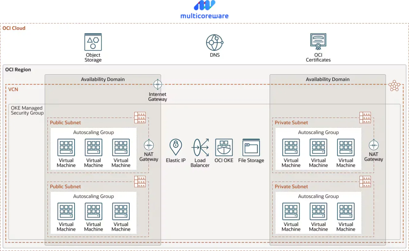 OCI includes all the services needed to migrate, build, and run IT in the cloud, from existing enterprise workloads to new cloud native applications and data platforms. MulticoreWare used the following OCI services and technologies to run their HuBe.ai application: