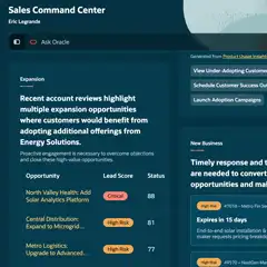 Sales guidance and forecasting Sales Command Center*** Helps sales leaders run their territory by continuously monitoring what’s happening across accounts, highlights key changes or risks, and recommends practical next steps for each account and opportunity.