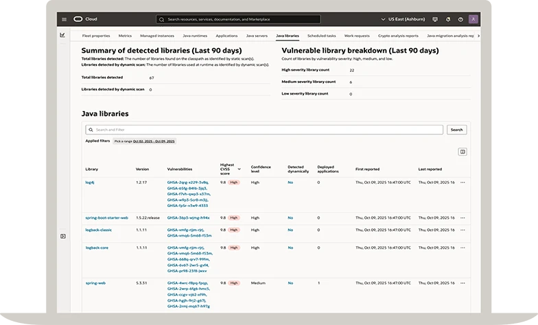Java Management Service on Oracle Cloud Infrastructure (OCI) offers centralized Java management with Java runtime and workload visibility, vulnerability assessment, Java lifecycle management task automation across fleets, and application security and performance analysis, helping you reduce risk, ensure compliance, and boost efficiency across all Java environments.