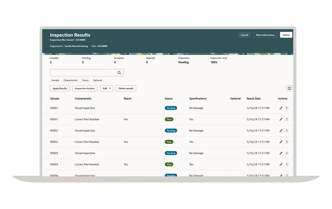 Built-in quality checks for incoming, in process, and final inspection ensure that materials and products meet quality standards without slowing down physical processes. Oracle Fusion Quality Management helps facilitate compliance and consistent product quality, resulting in fewer defects, higher customer satisfaction, and continuous operational improvement.