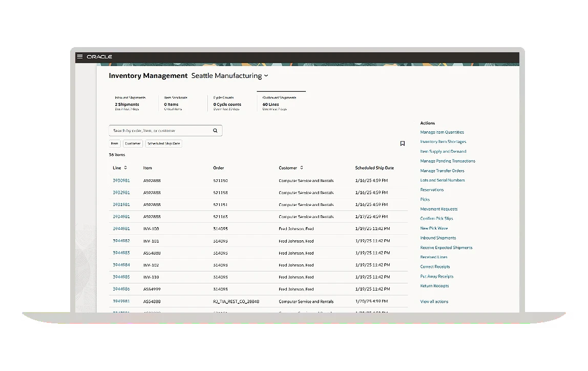 Oracle Fusion Cloud Inventory Management provides visibility into every item, movement, and transaction. Automate replenishment, track serial and lot numbers, and help ensure the right materials are in the right place at the right time to reduce carrying costs and stockouts.