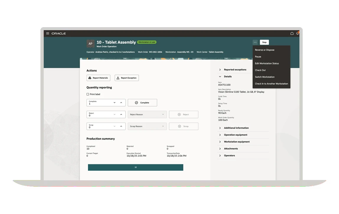 Oracle Fusion Cloud Manufacturing supports all production modes with integrated work orders and resource management to simplify shop floor execution for your business.