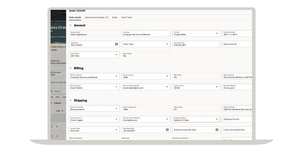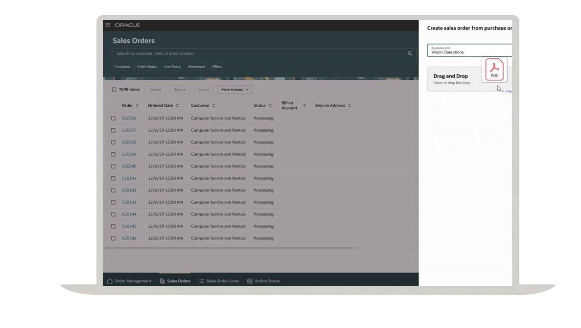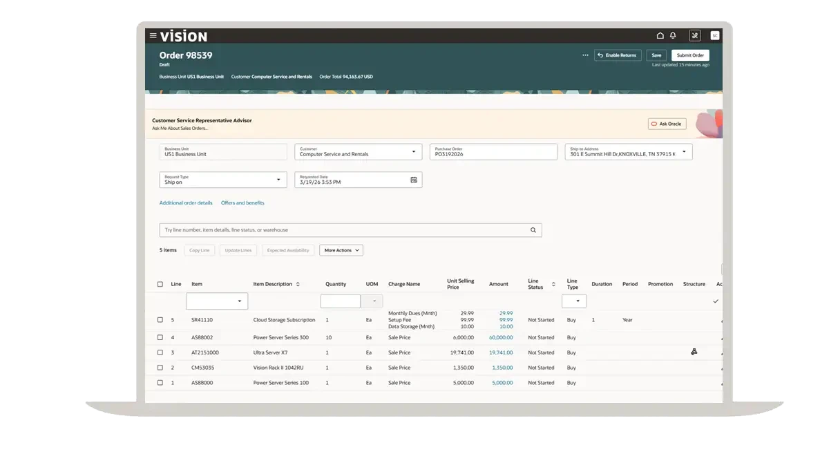 Oracle Order Management captures and revises orders for simple SKUs, configurable products, and services. User-defined rules auto-populate bill/ship details; apply dynamic pricing and discounts; check availability, taxes, and compliance; and validate orders before release. Orders arrive via the user interface, import, EDI, CPQ, commerce, or AI PDF capture.