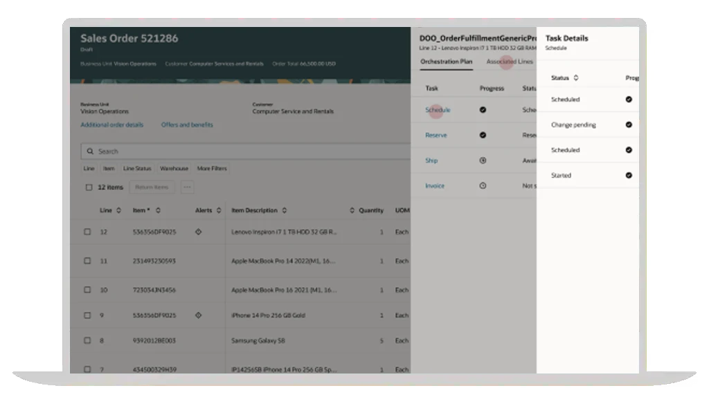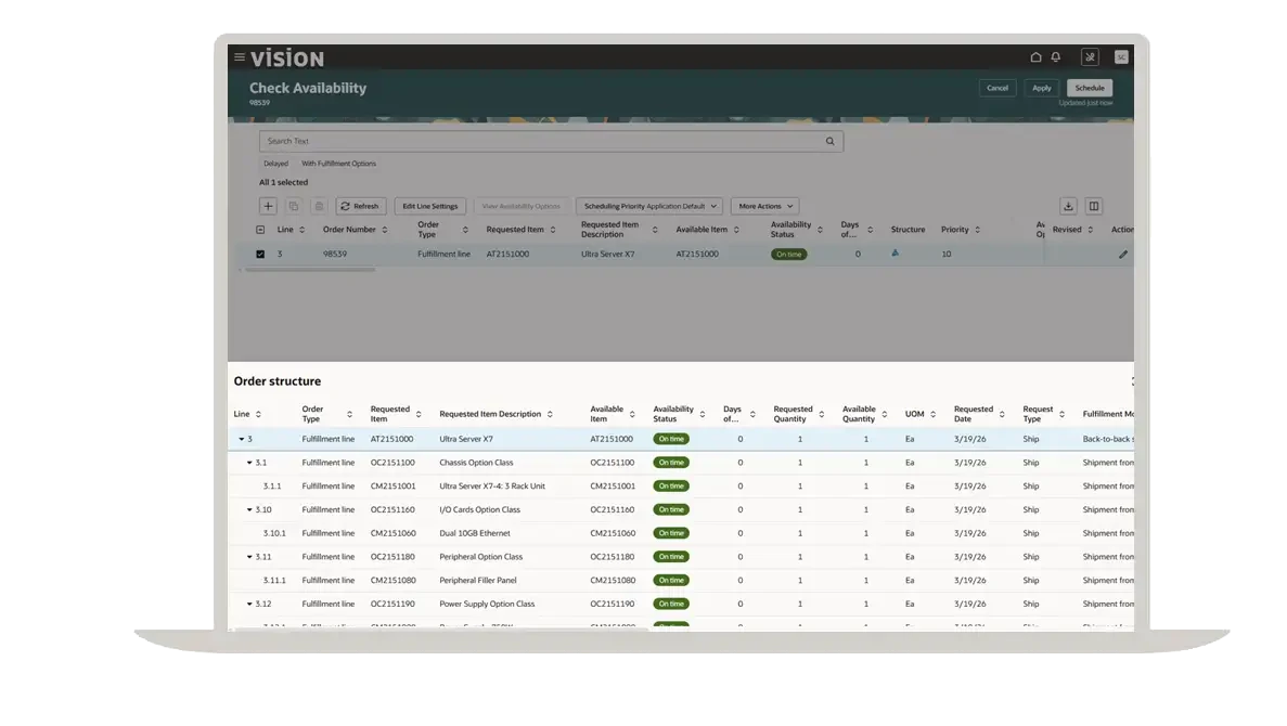Order Management includes Oracle Product Configurator and the ability to embed configuration logic with core product data to improve governance and lifecycle control. Product Configurator features built-in rule execution and validation to test and refine configurations early, helping reduce order errors and downstream rework.