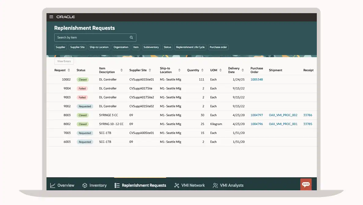 Get programmatic access to the real-time status of Oracle Supply Chain Management Cloud transactions via REST services.