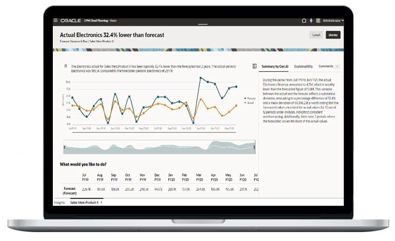 GenAI helps significantly accelerate thought to action, substantially reducing the manual effort involved in deriving insights. We believe that GenAI will continue to be seamlessly integrated with traditional AI to further enhance insights and predictions in innovative ways. Finance organizations will use GenAI to provide easy-to-understand contextual narratives that explain exceptions, anomalies, and variances in predictions versus forecasts, delivering deep analyses, observations, and recommended actions to address issues or capitalize on opportunities. These contextual narratives will enable broader sharing of insights up and down the organizational chain beyond the FP&A team. We believe that GenAI will also provide explanations of the specific factors that influence a given prediction. This explainability of prediction models is critical for building confidence and trust from the always-skeptical finance users.